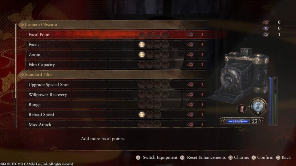 If you want to take advantage of that Fatal Frame moment during combat, you need fast-reloading film. This is a must-have upgrade during the early game so you’re not struggling later on.