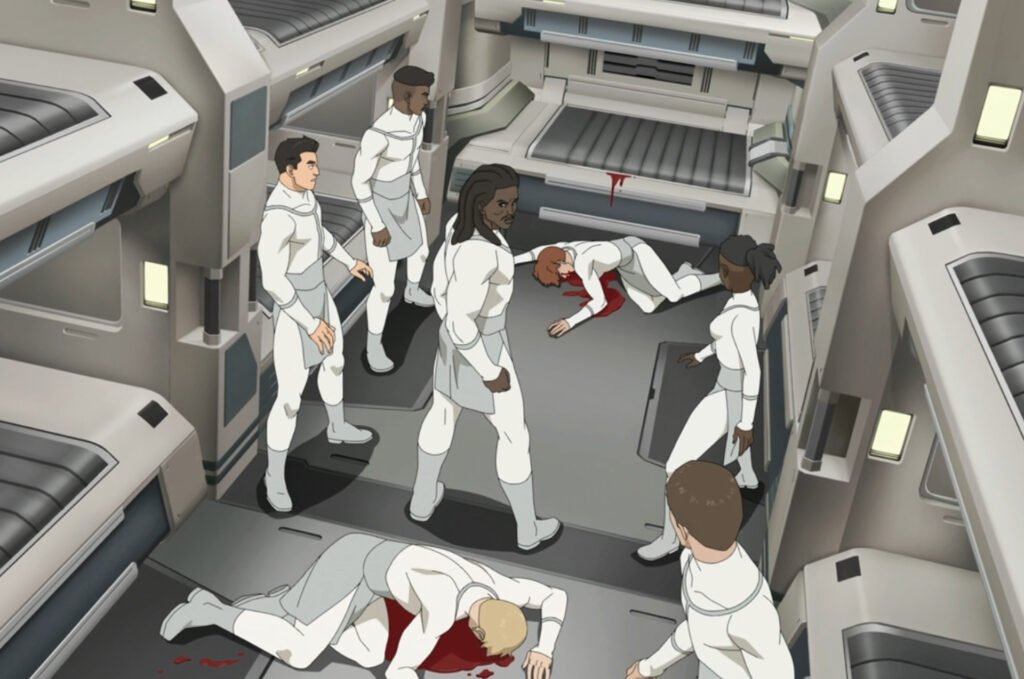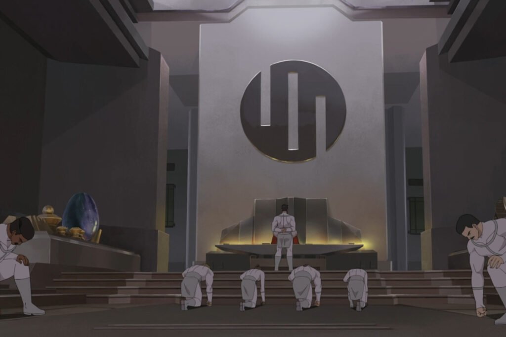 The sequence begins with a line of young Viltrumite students learning about the history of their people from Nolan, who was a teacher then. He recounts “The Great Purge,” an act of the Viltrumites who slaughtered anyone they deemed weak to build the ultimate empire. Nolan also tells the students about Emperor Argall, the ruler of Viltrum, who was assassinated by “The Betrayer,” which led the empire to descend into chaos.