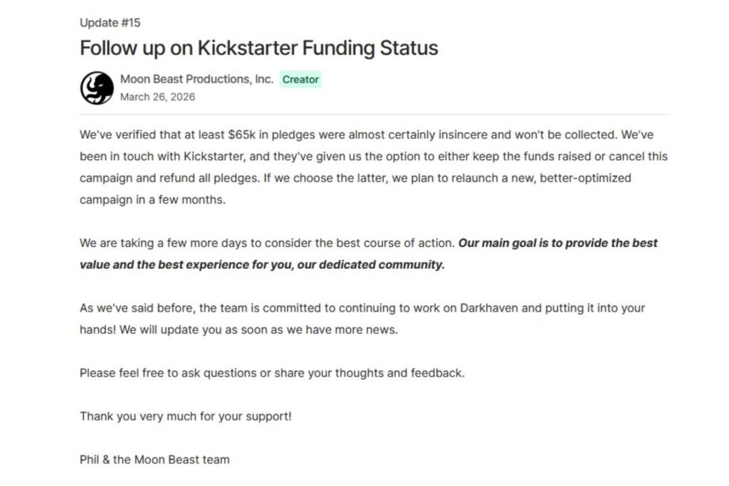 The devs started this project under their new studio, Moon Beast Productions, and launched a Kickstarter campaign in February 2026 with a $500,000 funding goal. While it met the goal in time, at least $65,000 of it has been confirmed as fake, per a recent dev update.